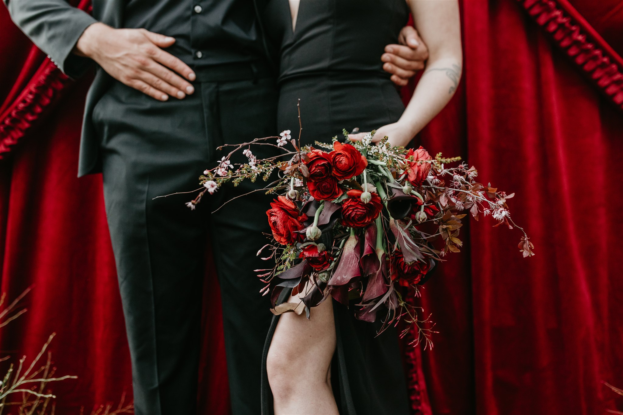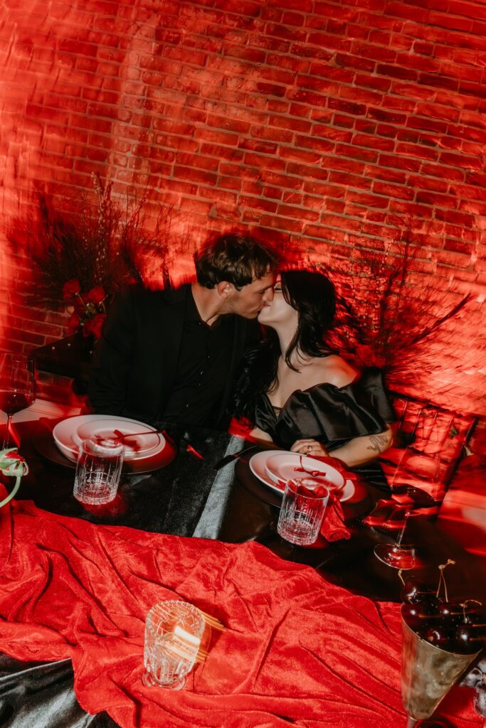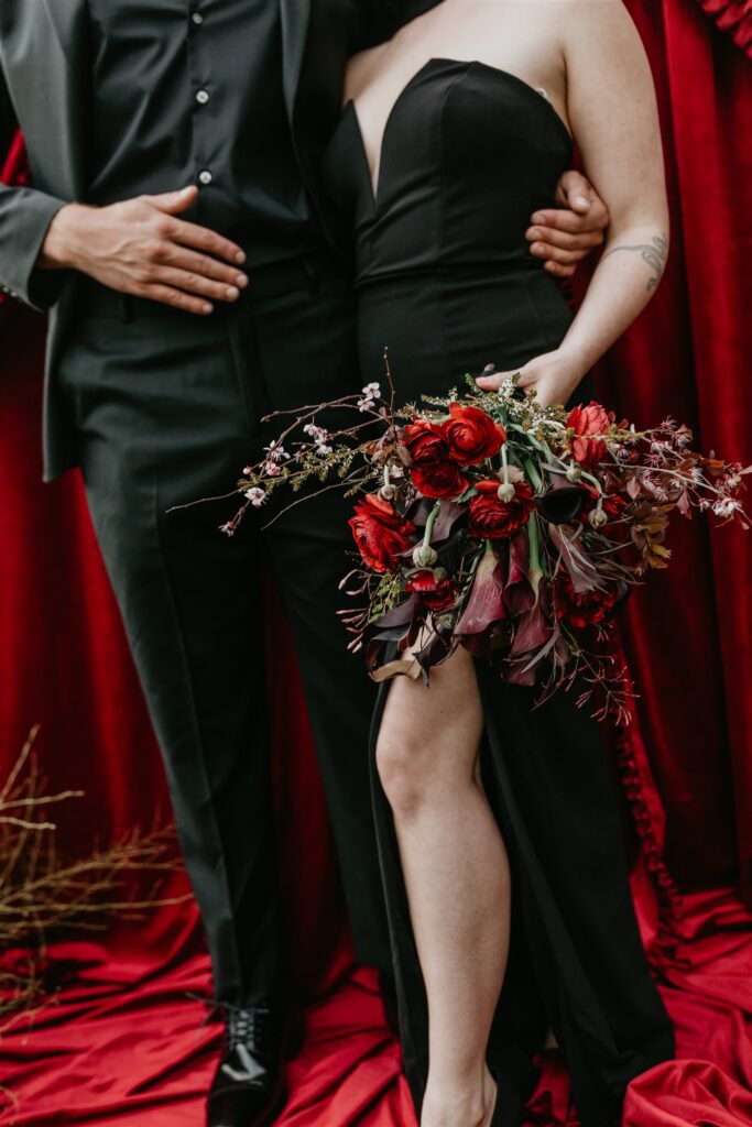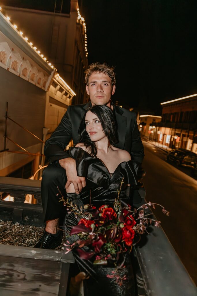 Set in the heart of downtown Nevada City, the couple leaned fully into a Gothic-inspired vision with deep reds, rich blacks, and candlelit details that perfectly complemented the hotel’s historic character. The bride made a bold and stunning choice to wear a black wedding dress, setting the tone for a day that felt dramatic, intimate, and completely true to her.